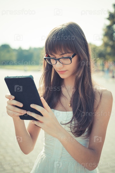 Молодая женщина в белом платье с планшетом