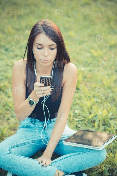 Молодая красивая брюнетка с планшетом и смартфоном