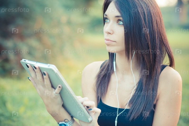 Молодая красивая брюнетка с планшетом и смартфоном
