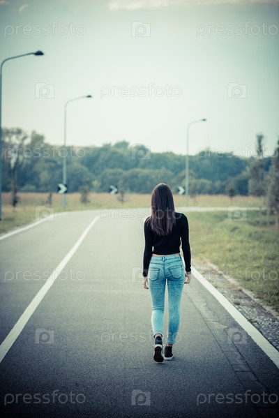Молодая красивая брюнетка на дороге