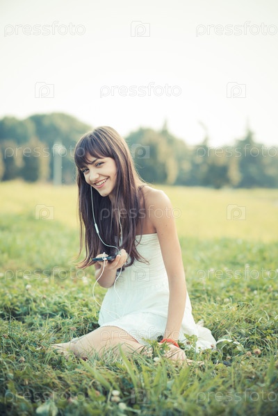 Красивая молодая женщина в белом платье слушает музыку