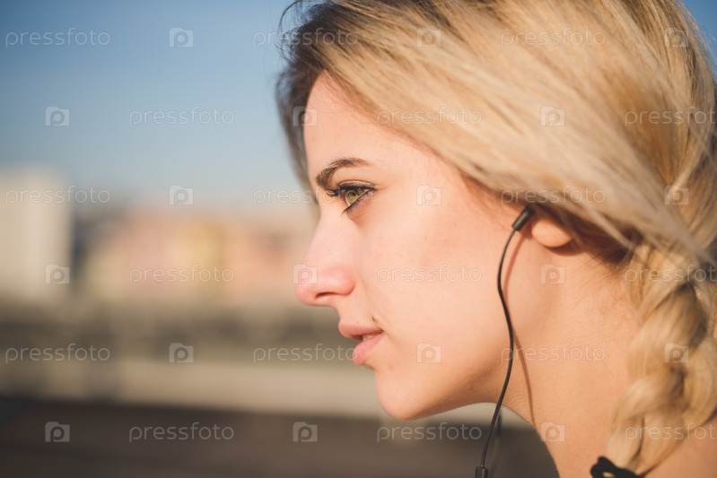 Молодая красивая блондинка слушает музыку