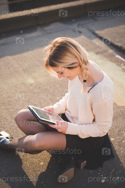 Блондинка с планшетом на улице