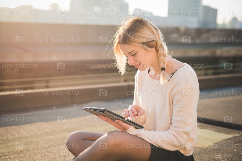 Блондинка с планшетом на улице