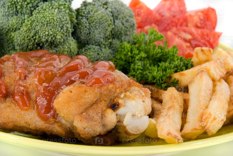 Курица с картофелем, сырыми овощами и зеленью