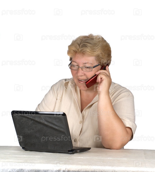 Женщина с мобильным телефоном, работающая на ноутбуке
