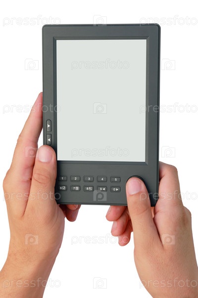 Устройство для чтения электронных книг в руках, белый фон