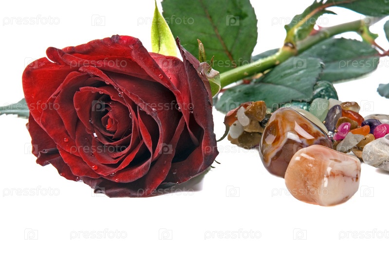 Драгоценные камни и роза на белом фоне