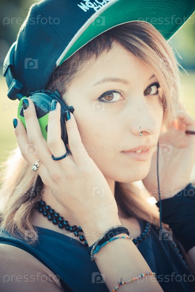 Молодая красивая женщина слушает музыку