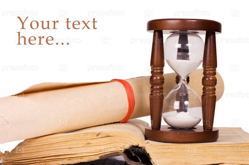 Старые песочные часы и книга на белом фоне