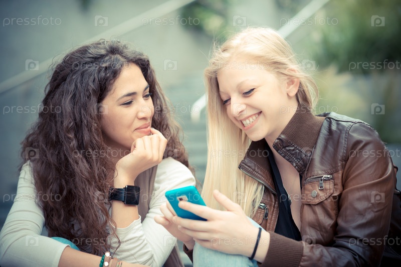 Блондинка и брюнетка со смартфоном