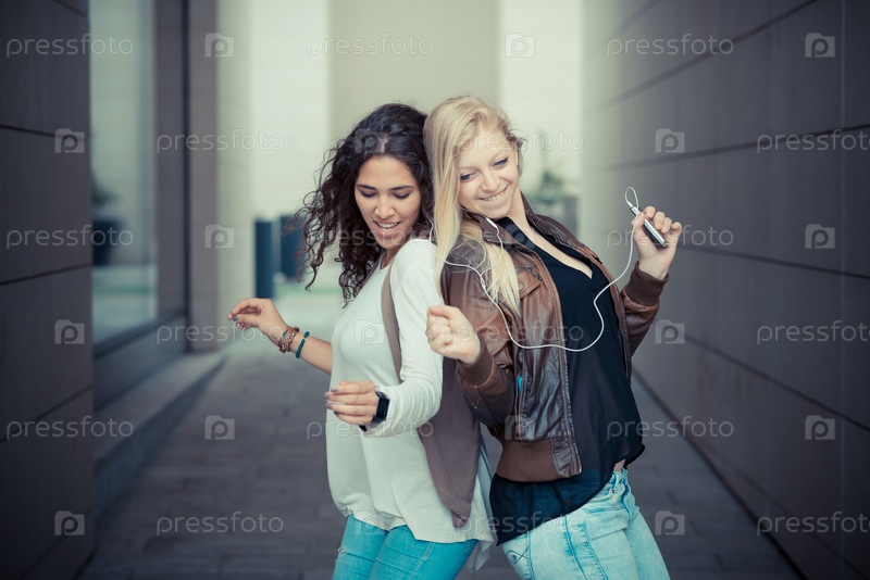 Блондинка и брюнетка со смартфоном