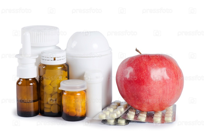 Таблетки и яблоко на белом фоне, концепция