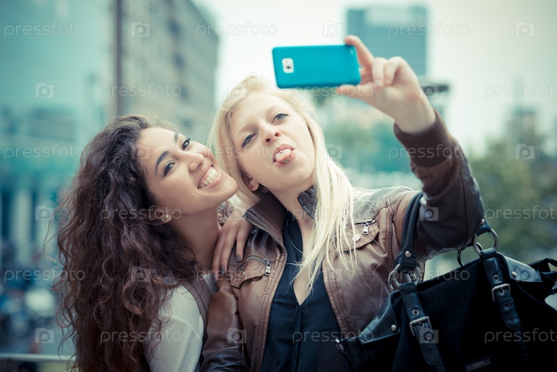 Блондинка и брюнетка со смартфоном