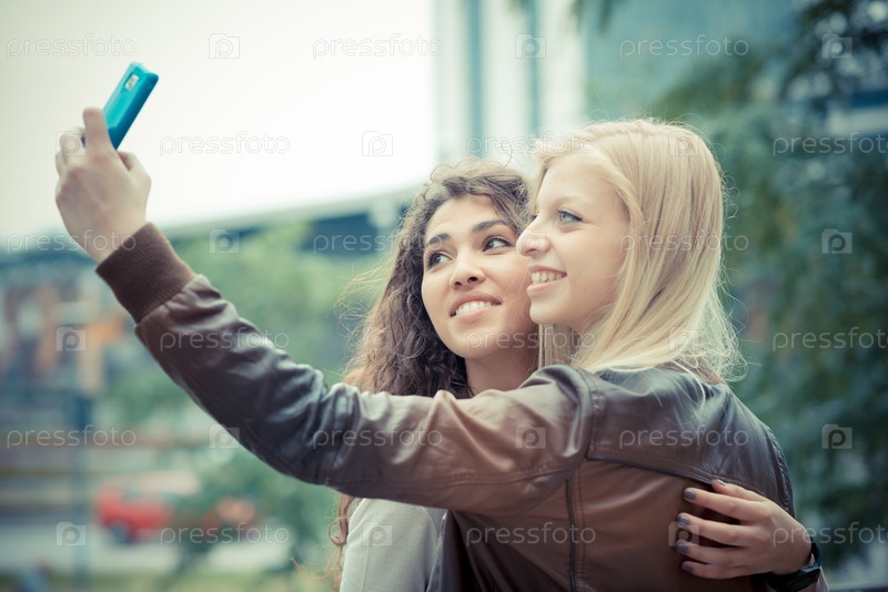 Блондинка и брюнетка со смартфоном
