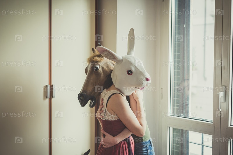 Девушки в масках кролика и лошади