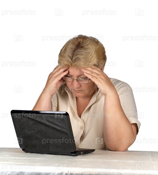 Задумчивая женщина работает на ноутбуке