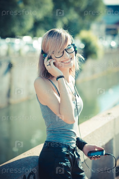 Молодая красивая модель слушает музыку