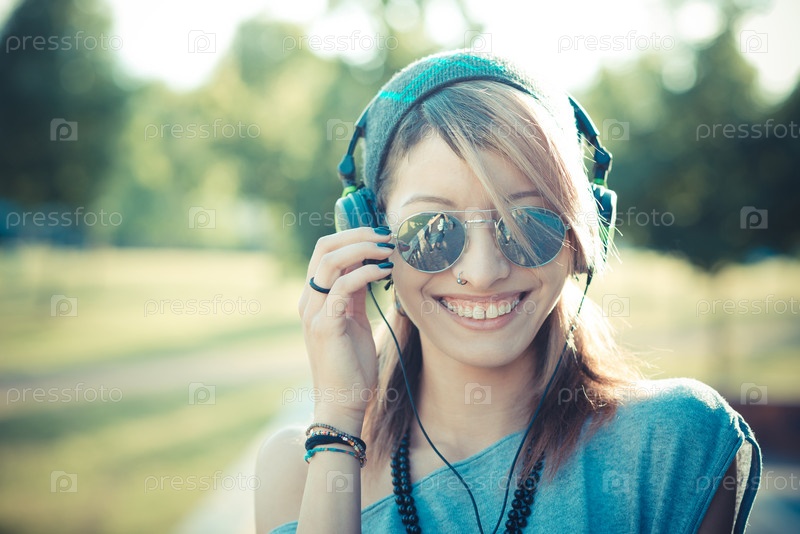 Молодая красивая модель слушает музыку