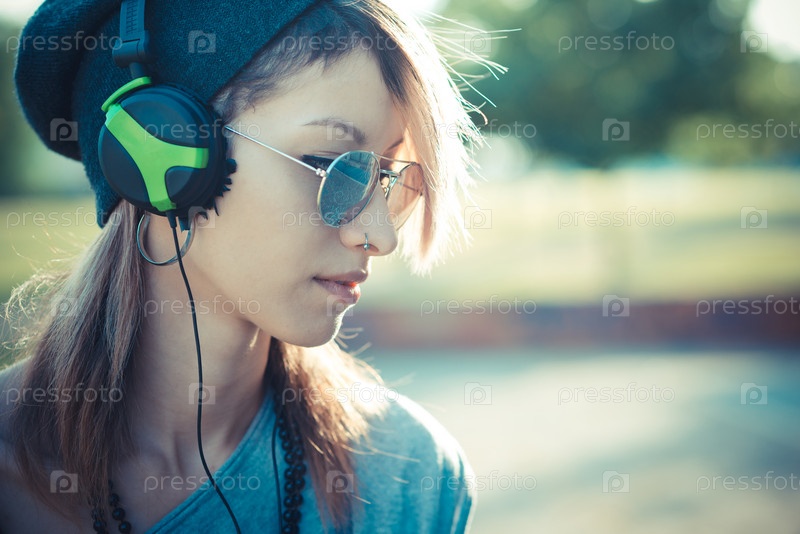 Молодая красивая модель слушает музыку