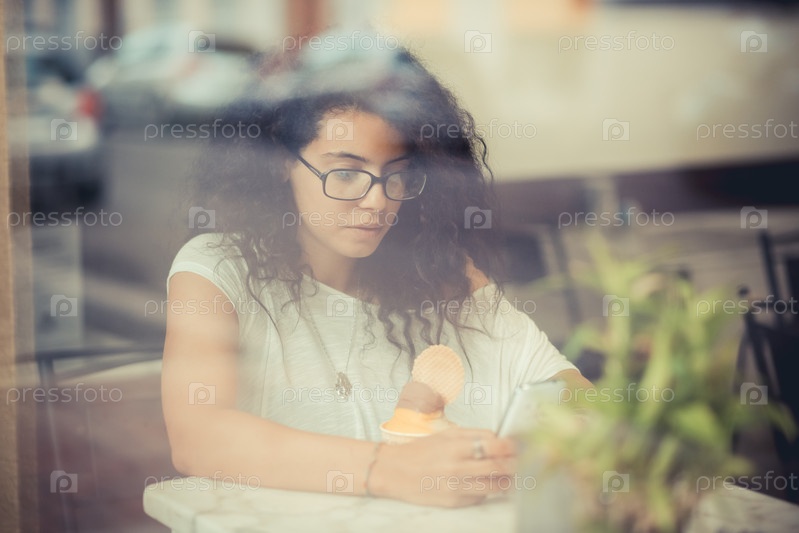 Молодая красивая женщина ест мороженое