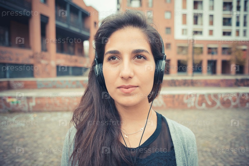 Молодая красивая брюнетка в наушниках