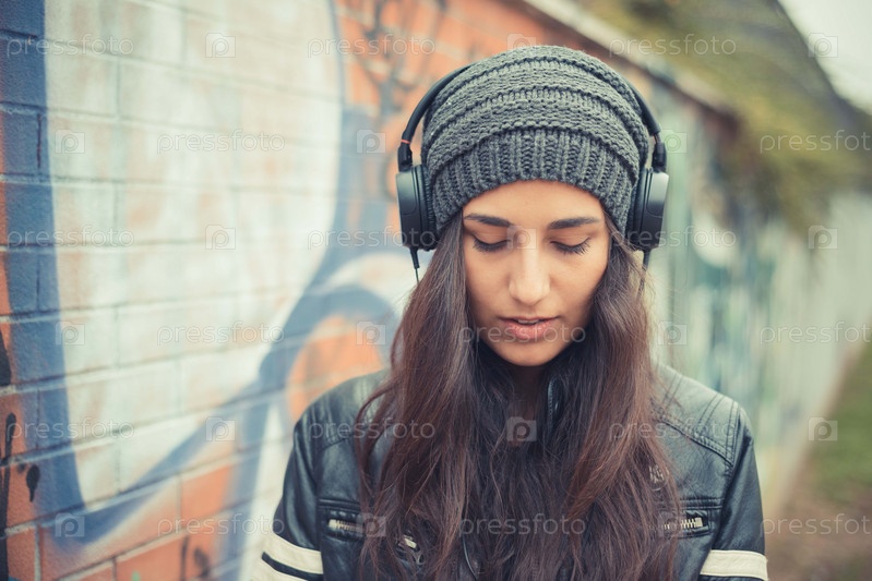 Молодая красивая брюнетка в наушниках