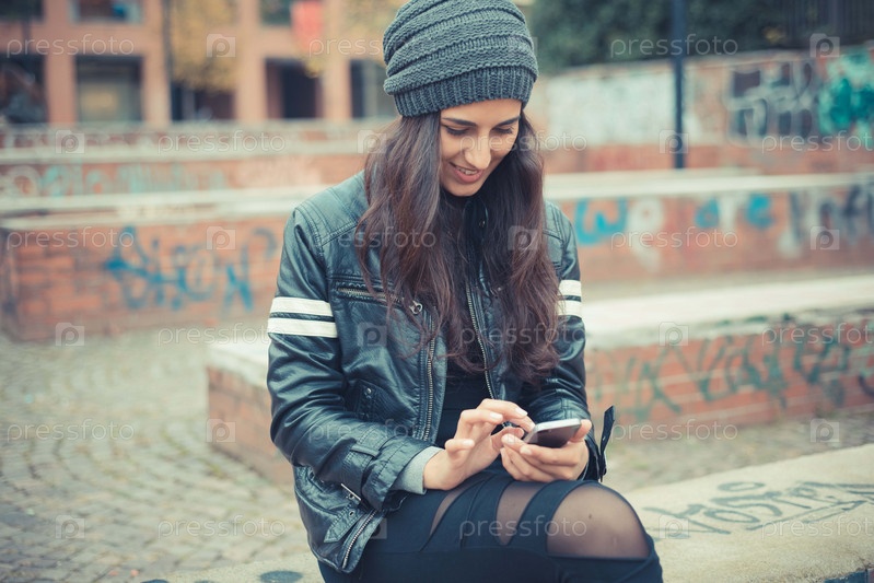 Молодая красивая брюнетка со смартфоном