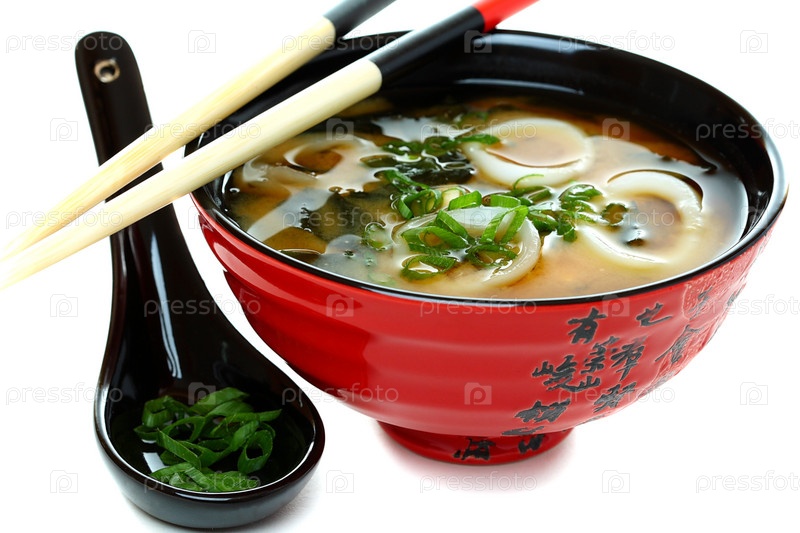 Суп мисо с морепродуктами и зеленым луком на белом фоне