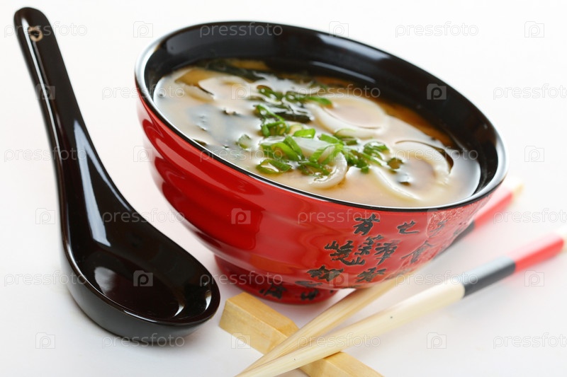 Суп мисо с морепродуктами и зеленым луком на белом фоне