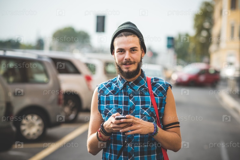 Молодой бородатый хипстер на улице