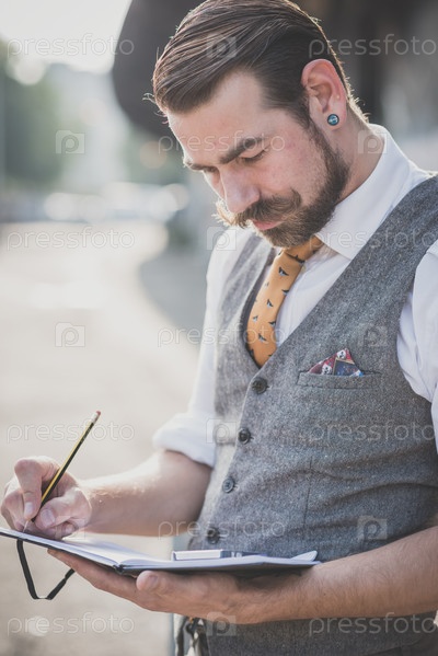 Красивый бородатый мужчина-хипстер на улице