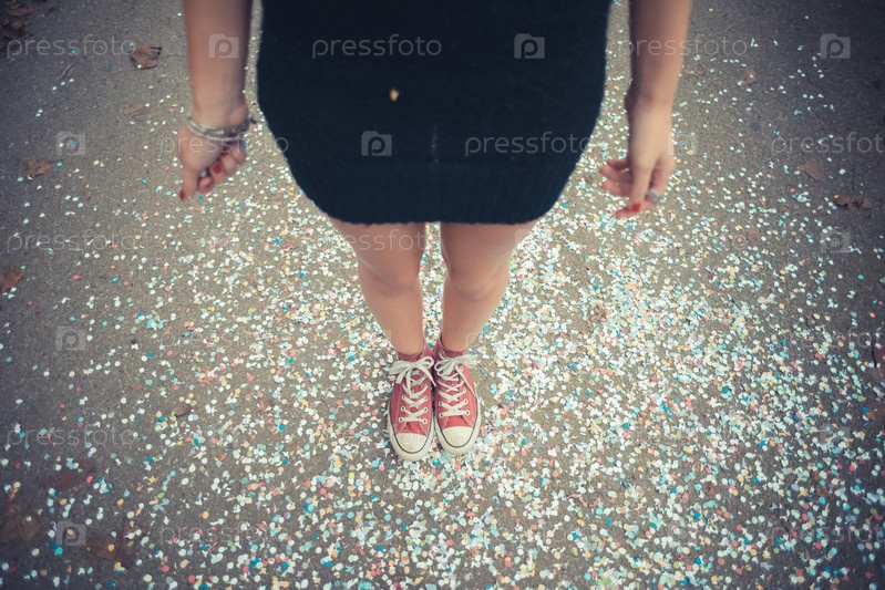 Женщина и конфетти на тротуаре