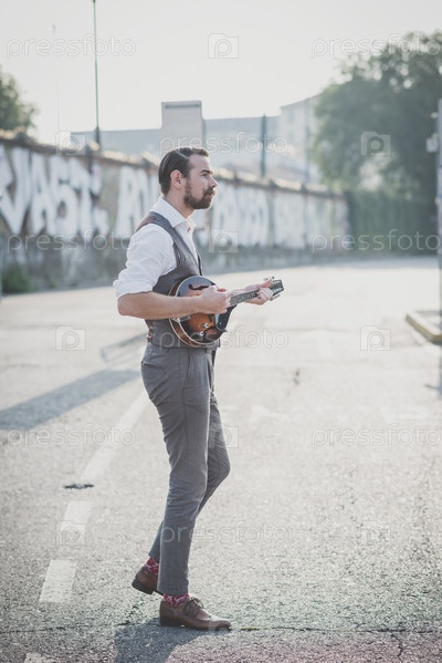 Усатый хипстер играет на мандолине