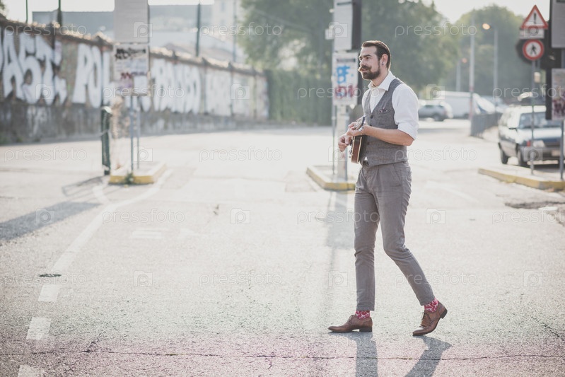 Усатый хипстер играет на мандолине
