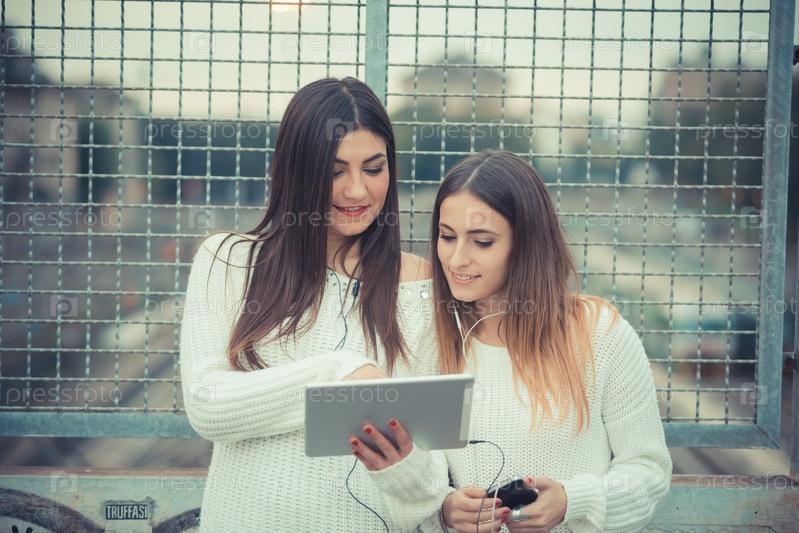 Пара красивых девушек с планшетом