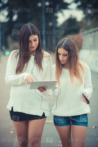Пара красивых девушек с планшетом