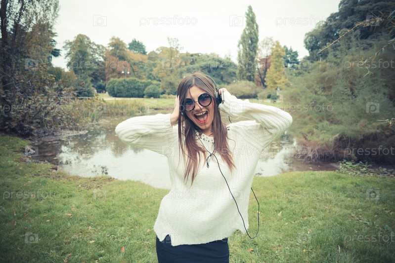 Молодая красивая брюнетка в наушниках