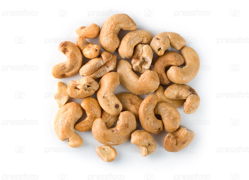 Жареные орехи кешью на белом фоне