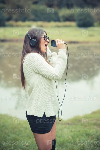 Молодая красивая брюнетка в наушниках