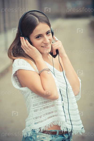 Молодая красивая женщина слушает музыку