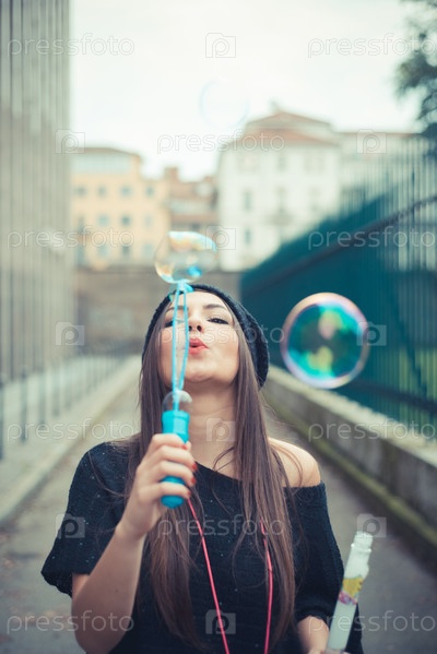 Молодая красивая женщина пускает мыльные пузыри