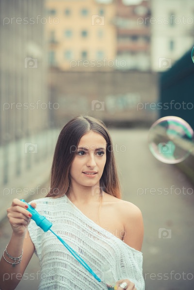Молодая красивая женщина пускает мыльные пузыри