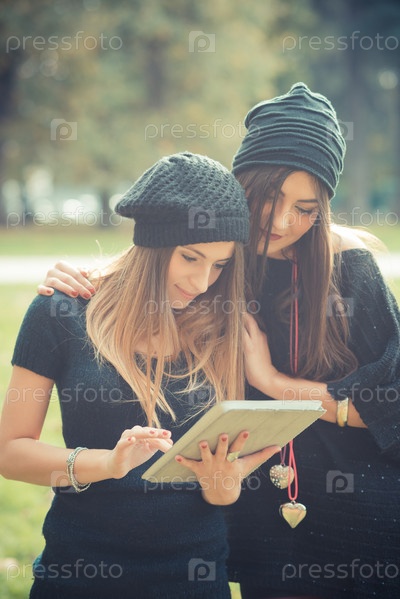 Пара красивых девушек с планшетом