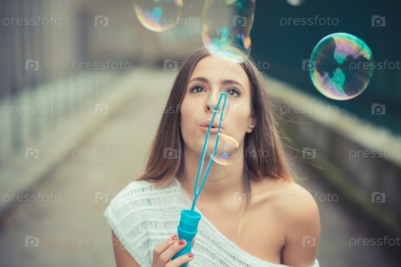 Молодая красивая женщина пускает мыльные пузыри