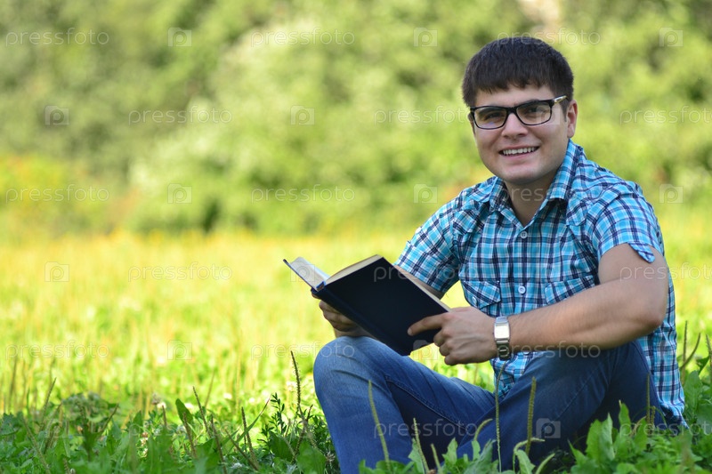 Парень читает книгу в парке