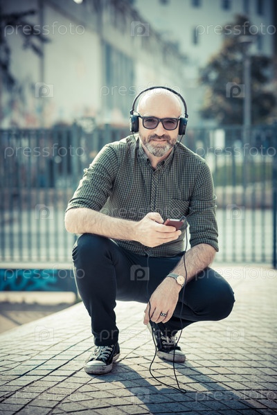 Мужчина среднего возрасте слушает музыку