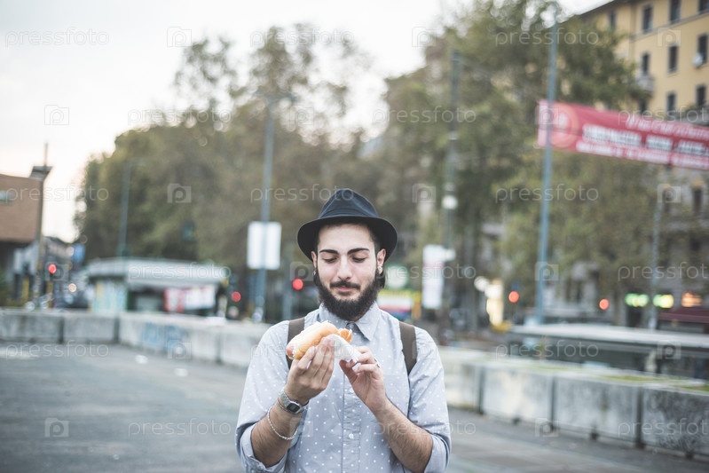 Молодой хипстер ест хот-дог