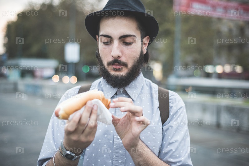 Молодой хипстер ест хот-дог