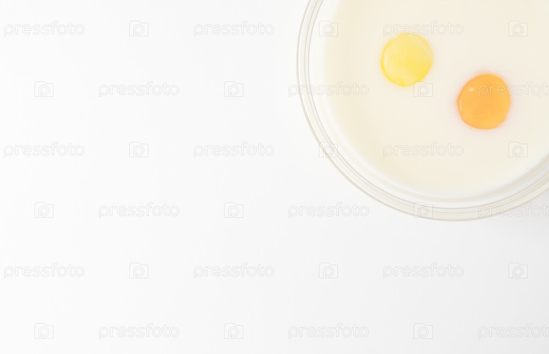 Два яйца и молоко в стеклянной миске на светлом фоне